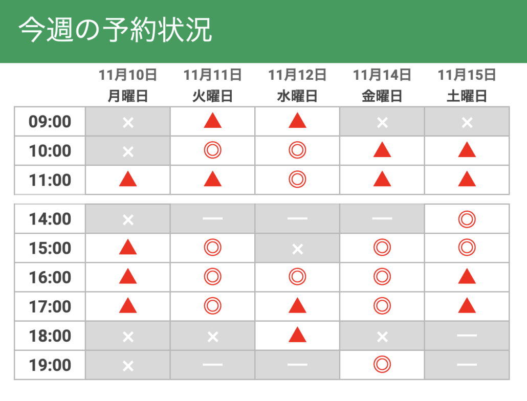 ◎ 予約状況の目安です (新患の場合、担当者の都合により対応できない場合もございます)
