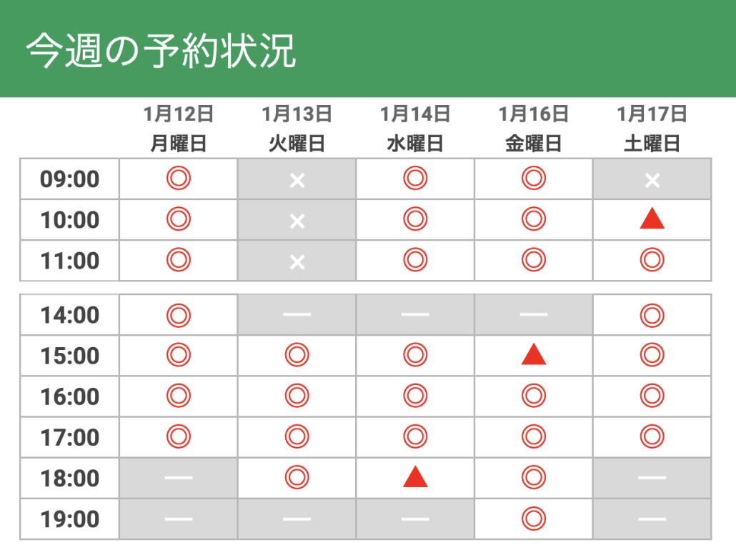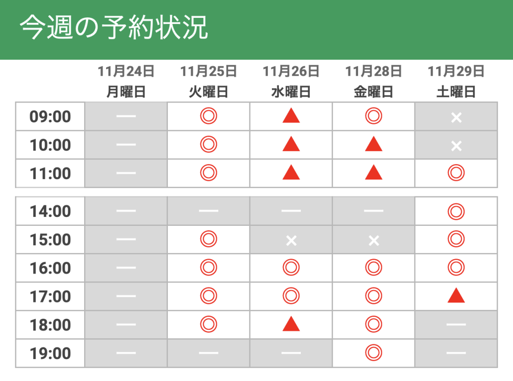 ◎ 予約状況の目安です (新患の場合、担当者の都合により対応できない場合もございます)
