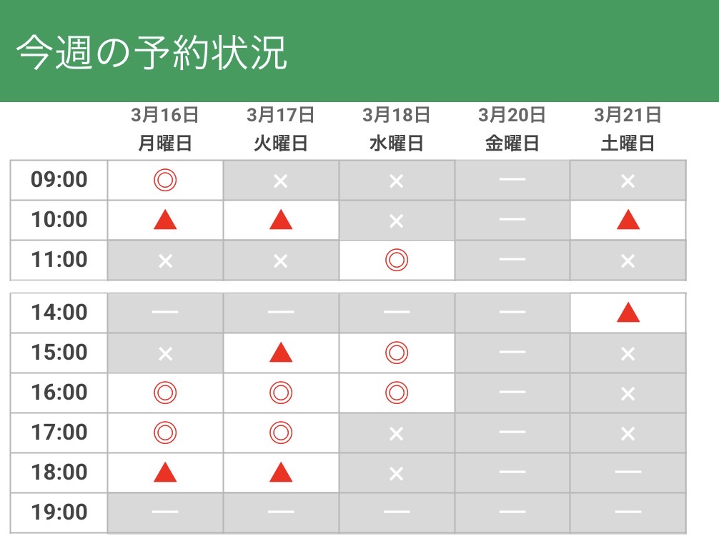 今週(3/16~3/21)の予約状況