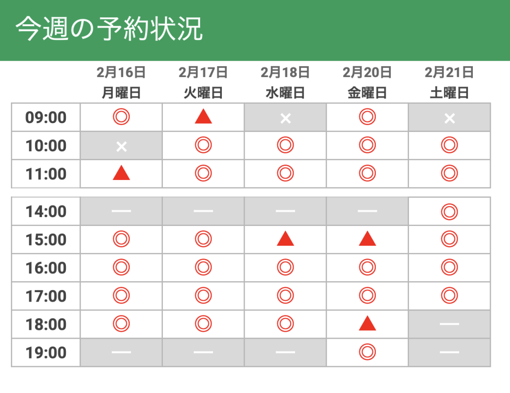 ◎ 予約状況の目安です (新患の場合、担当者の都合により対応できない場合もございます)