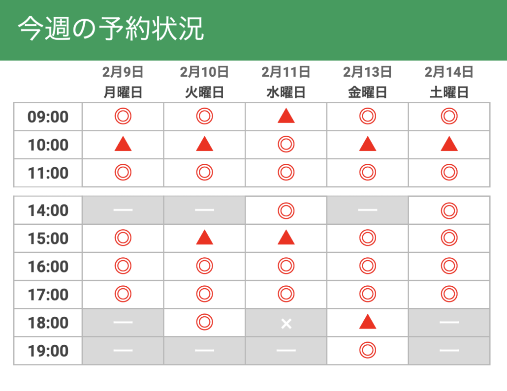 ◎ 予約状況の目安です (新患の場合、担当者の都合により対応できない場合もございます)